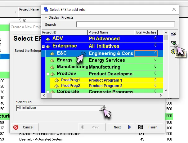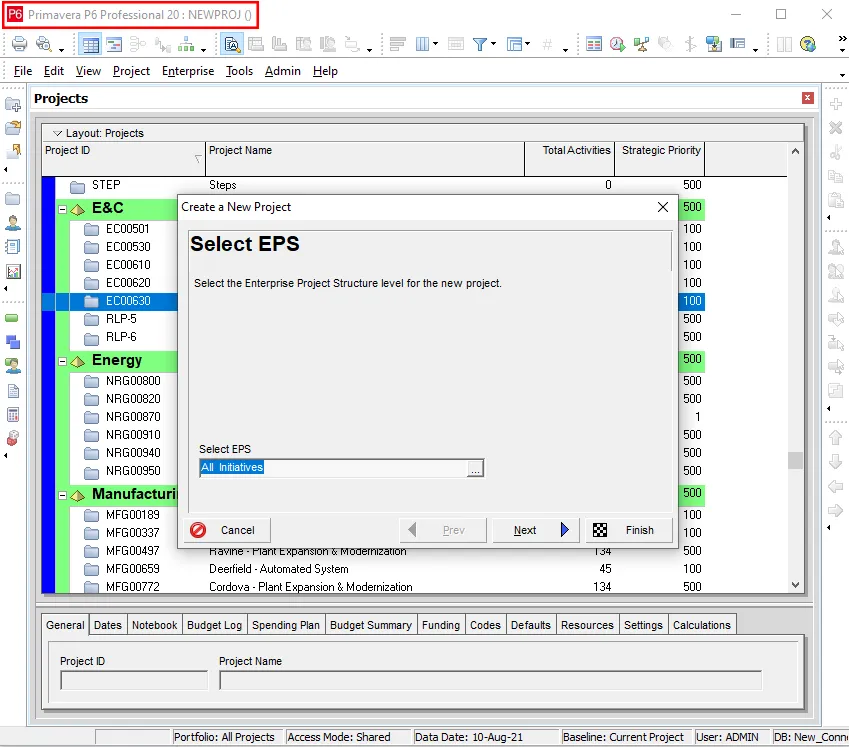 Once your EPS is established, you can create new projects, an essential step in any EPC Planning in Primavera P6 workflow.
