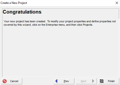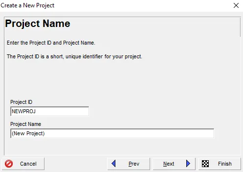 This opens the New Project Wizard, which will walk you through setting up your project’s key parameters. A new project with a default Project ID is created and displayed in the title bar when the wizard launches.
