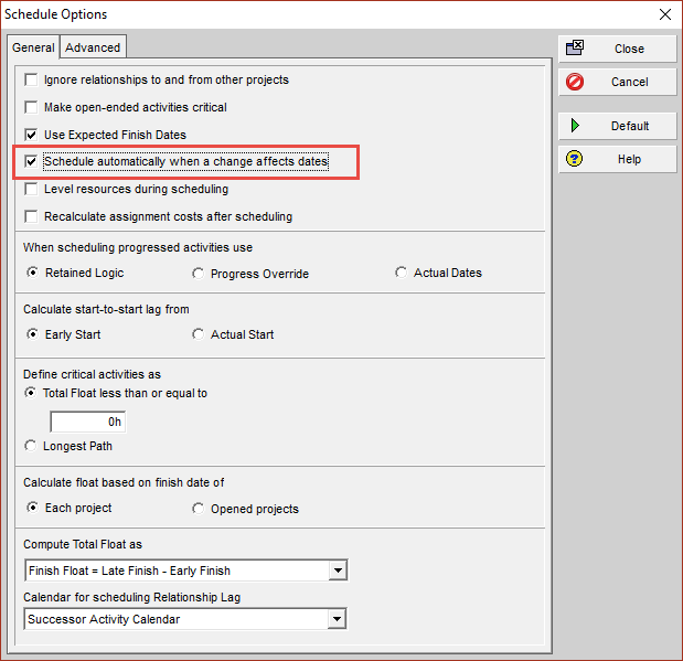 - Under the General tab, check the box for Schedule automatically when a change affects dates to activate auto-scheduling.