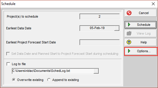 - In the dialog box that appears, click Options to view the scheduling configuration settings.